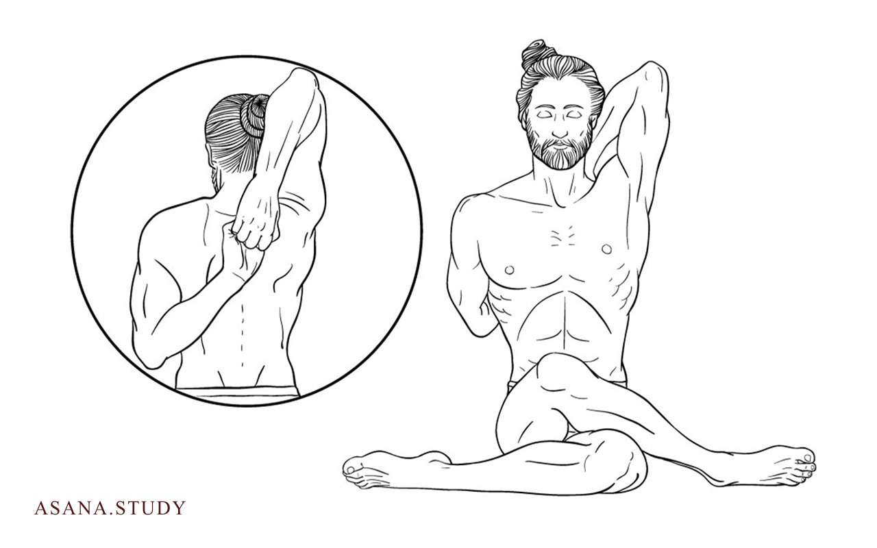 - Sit in a comfortable cross-legged position (Sukhasana) or even on a chair with a straight back. Make sure you are sitting upright without leaning. Perform only the arm position described above (with or without a strap), focusing on the sensations in your shoulders and upper back. This is ideal if your main challenge or goal is to open the shoulder joints, and the full leg position is currently inaccessible or distracting.