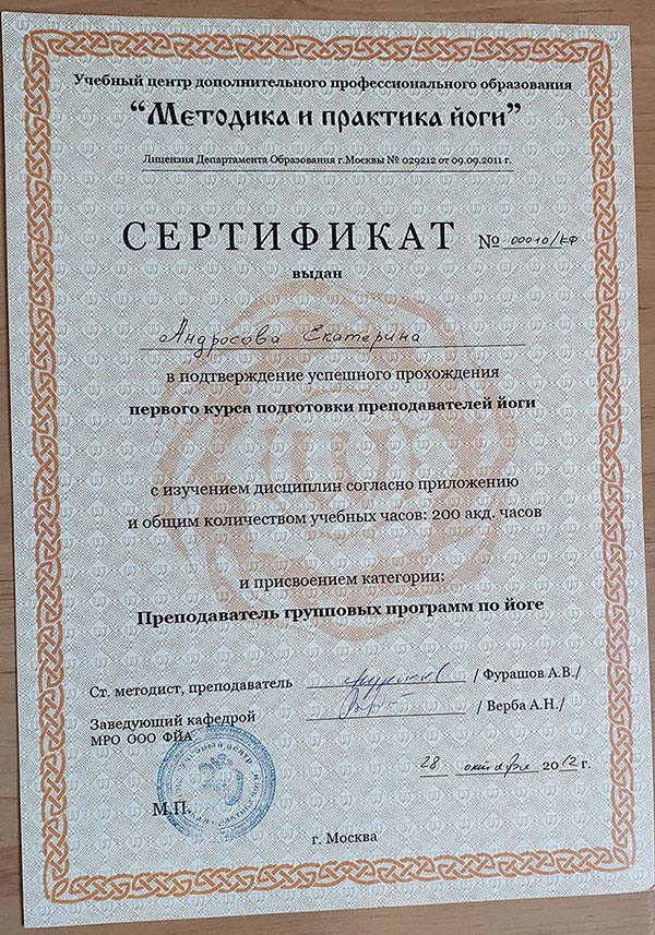 - 2012: advanced training course for yoga teachers at the educational center for additional professional education "Methodology and Practice of Yoga" (license of the Moscow Department of Education No. 029212 dated 09.09.2011).