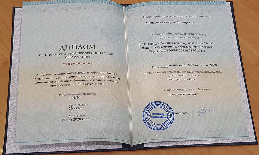 - 2020 to present. in.: course for yoga teachers of the oum.ru club at the ANO DPO "Training Center for Yoga Teachers" (license of the Moscow Department of Education No. 10256 dated 05/28/2018).